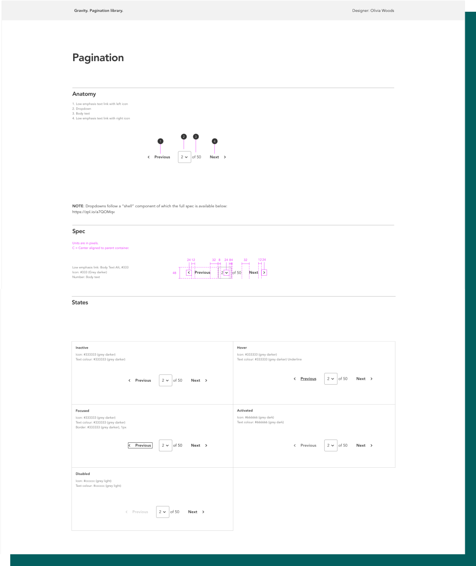 As a way of maintaining consistency between designer and developer, we created specs for the developers to use when creating components.
