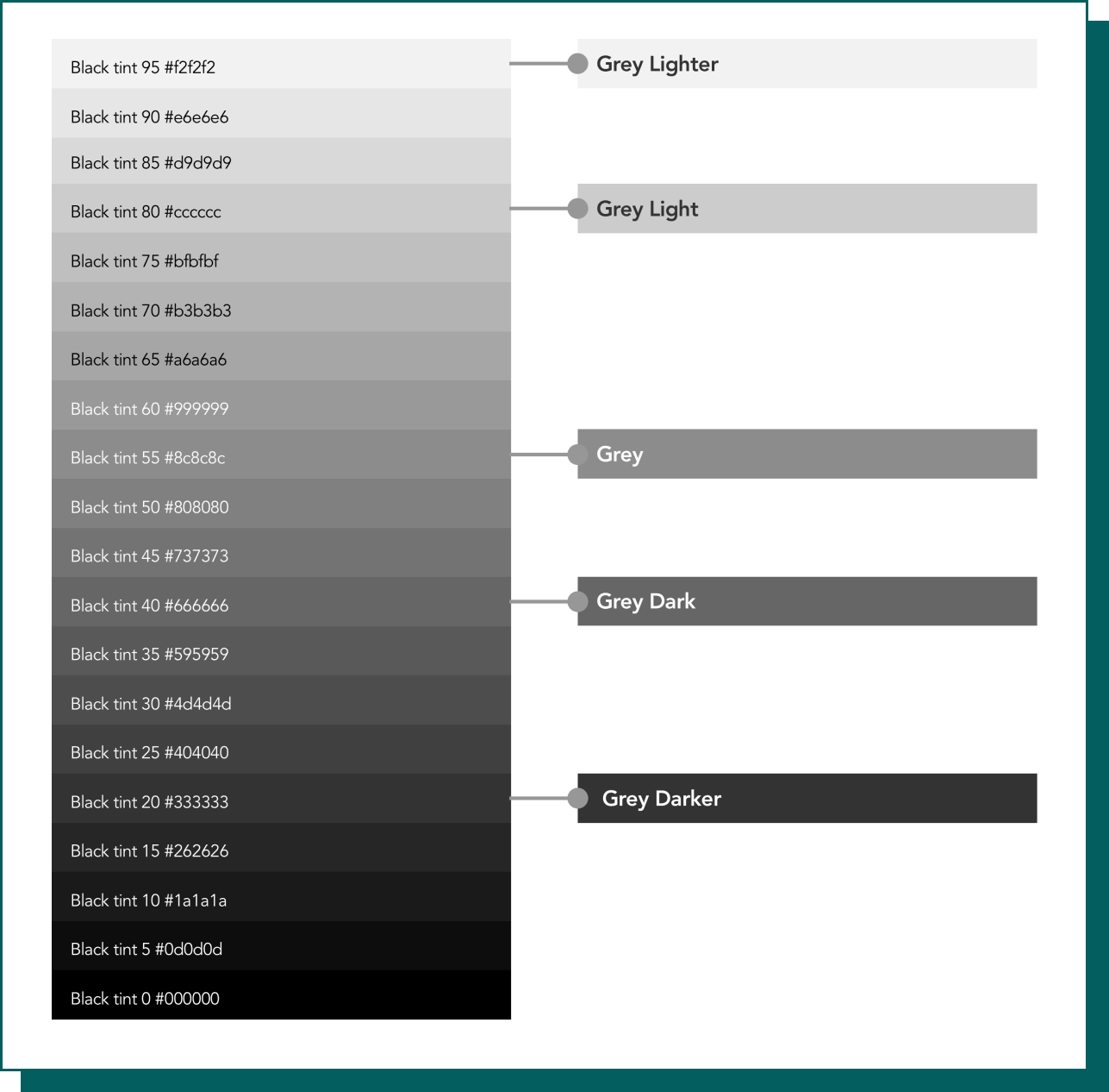 The grey palette was developed by auditing and assessing colour usage across all sites on the platform and finding common colours that would be used intentionally and have a clear purpose.